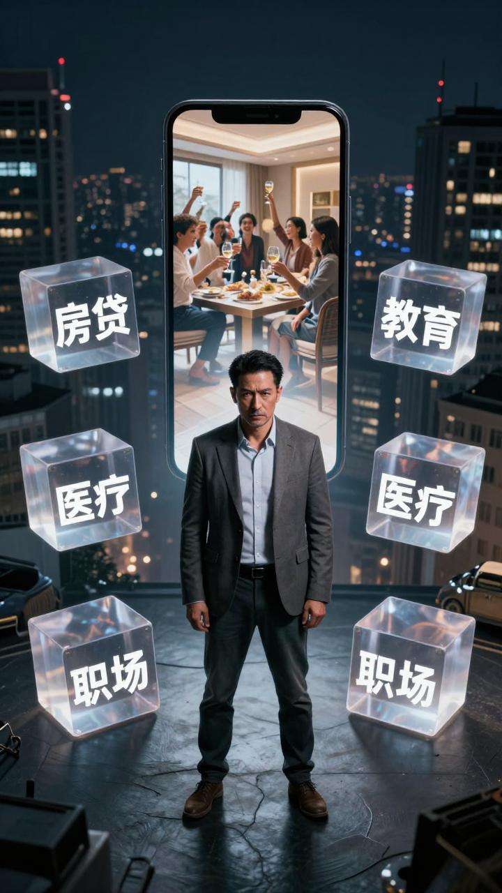 父辈的焦虑是矩形,有穷、有病、有饭吃就行。而我们的焦虑是立方体,摊开来看是钱、孩子的教育、老人的医疗、自己的职场天花板、邻居的经济机场车……所有因素都在互相交叉。更关键的是,现在的信息流速度把“他人的成功”放大了1000倍,你可以在短视频里看到一个25岁的大V在海南谈几个亿的项目,也可以看到同岁数的邻居买了第三套房。但你永远看不到他们背后的欠款和失眠夜。